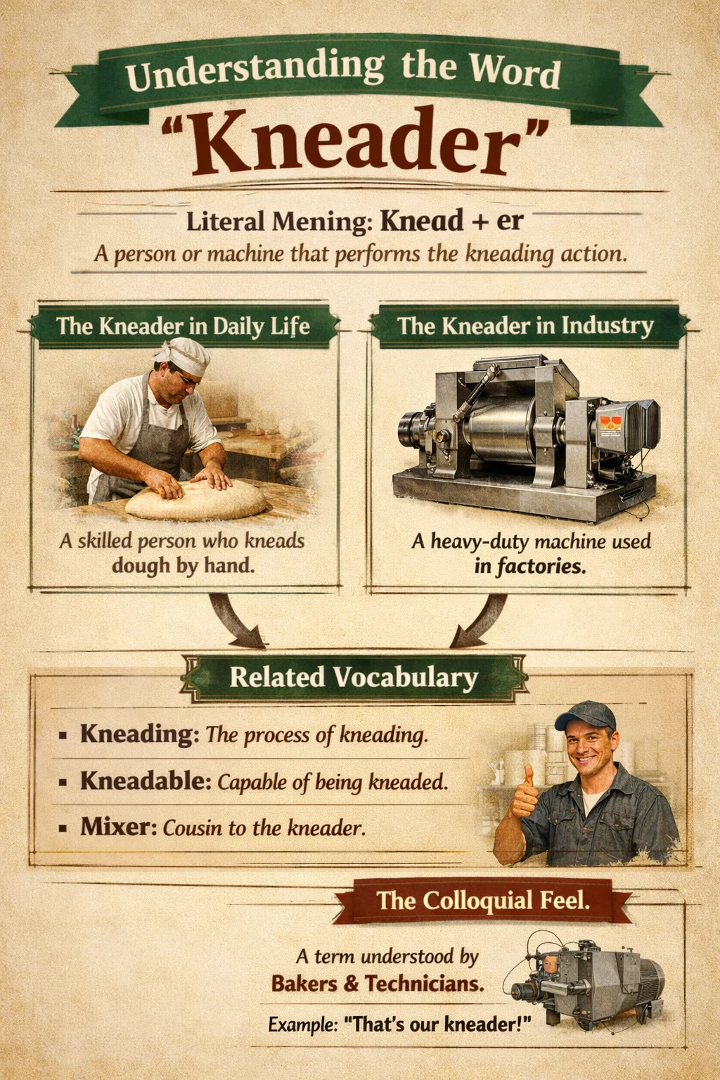 Par conséquent, la signification originale du mot pétrisseur est : une personne ou une machine qui effectue l’action de pétrissage.