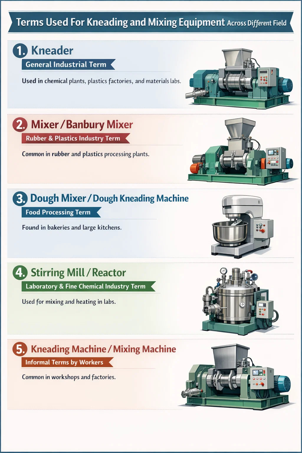 Concernant les équipements tels que les « pétrins » ou les « pétrins à pâte », les noms utilisés varient considérablement selon les domaines et les industries. Bien que leur fonction principale soit de mélanger les matériaux grâce à un pétrissage puissant, les noms utilisés diffèrent considérablement selon l'application.