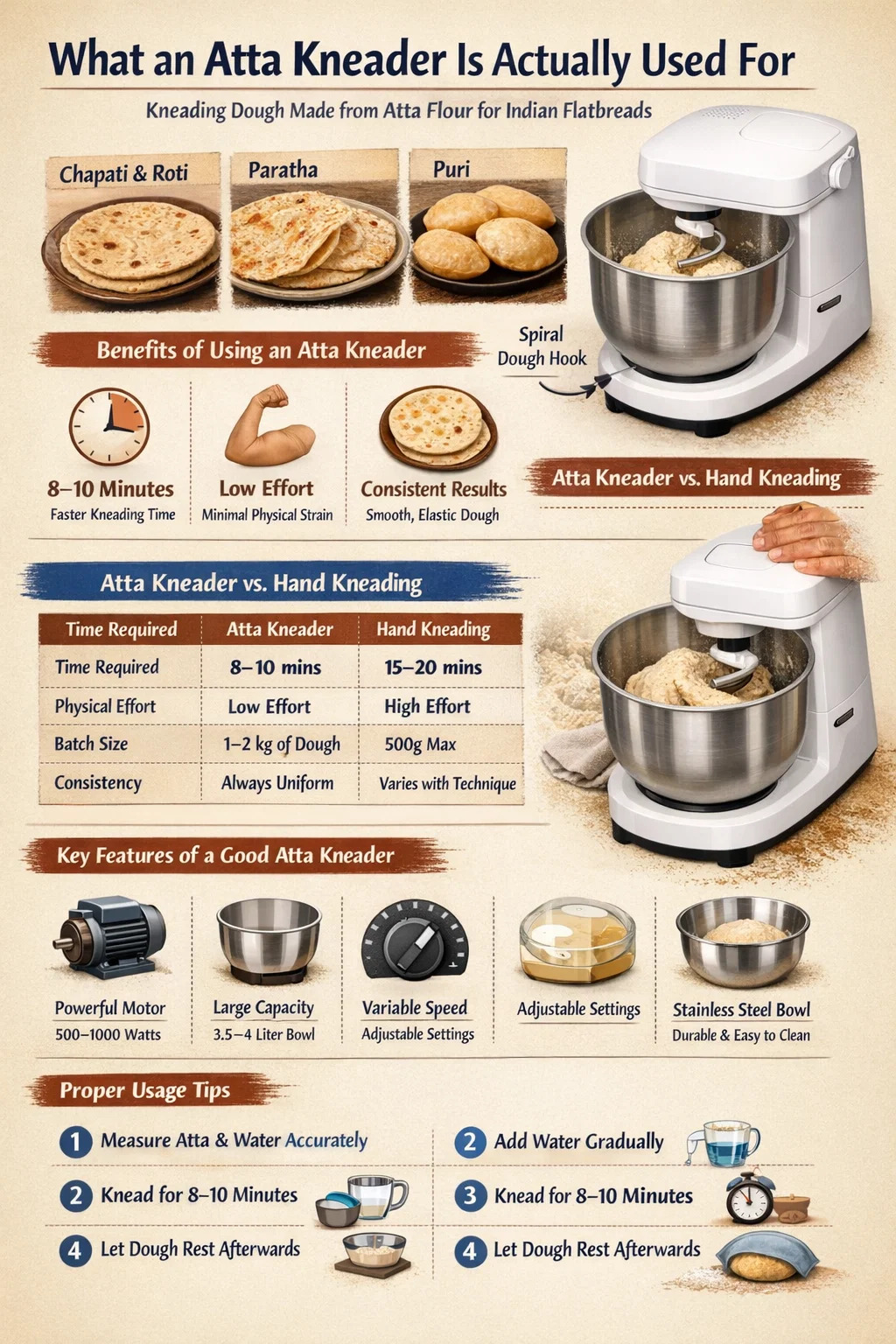 Le terme « pétrin atta » est utilisé à la fois pour les machines de comptoir autonomes construites spécifiquement à cet effet et pour les accessoires de pétrissage de la pâte qui s'adaptent aux batteurs sur socle. Les deux fonctionnent sur le même principe mécanique, bien que les unités autonomes soient souvent optimisées spécifiquement pour la viscosité et la densité de la pâte atta au blé entier.